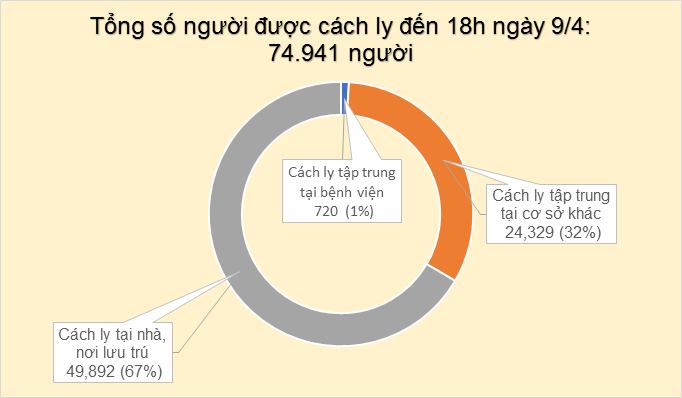 Số người cách ly:Tổng số người tiếp xúc gần và nhập cảnh từ vùng dịch đang được theo dõi sức khỏe (cách ly): 74.941, trong đó: