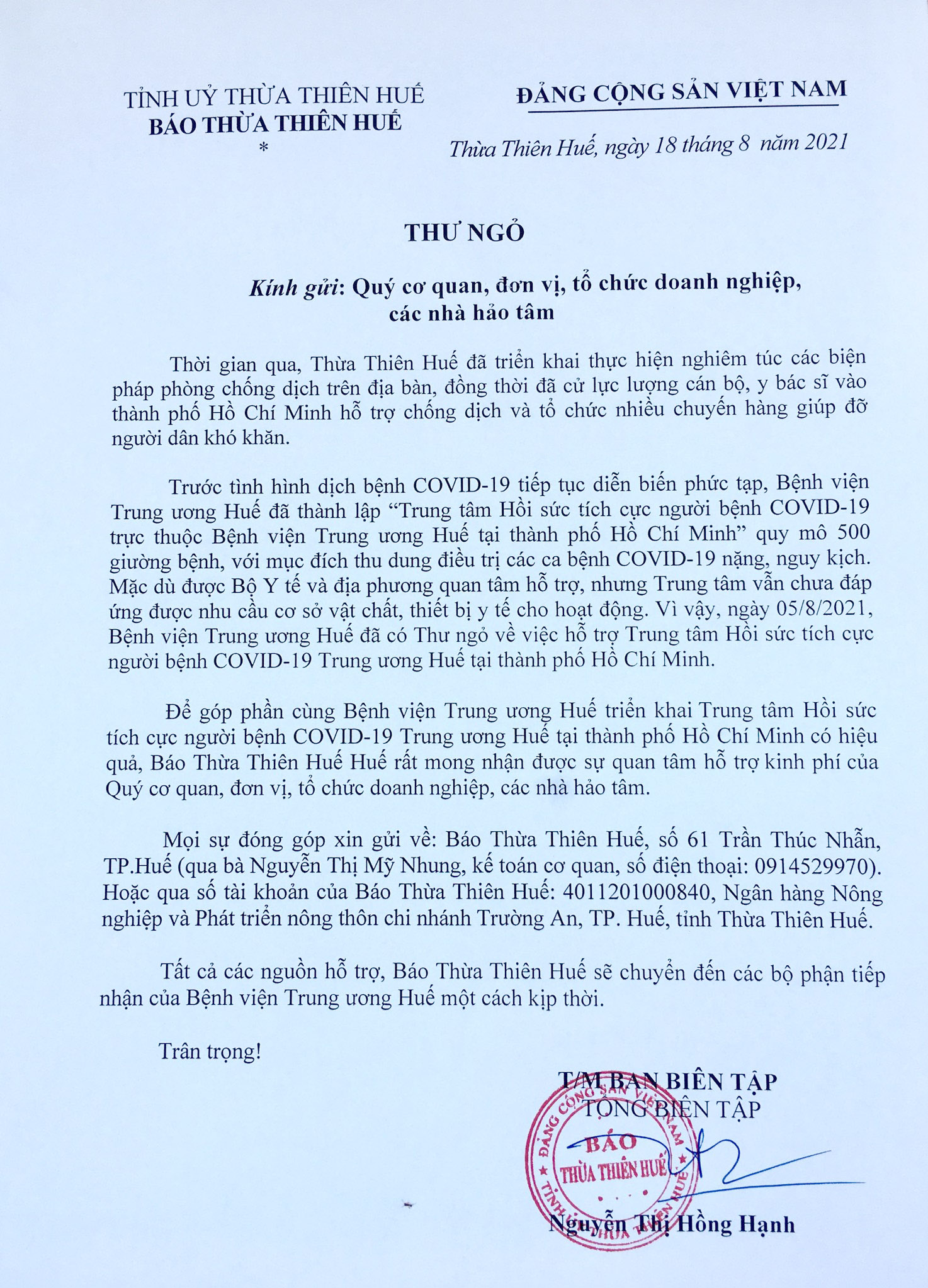 HNN.VN - Để góp phần cùng Bệnh viện Trung ương Huế triển khai Trung tâm Hồi sức tích cực người bệnh COVID-19 Trung ương Huế tại thành phố Hồ Chí Minh có hiệu quả, Báo Thừa Thiên Huế Huế rất mong nhận được sự quan tâm hỗ trợ kinh phí của Quý cơ quan, đơn vị, tổ chức doanh nghiệp, các nhà hảo tâm.