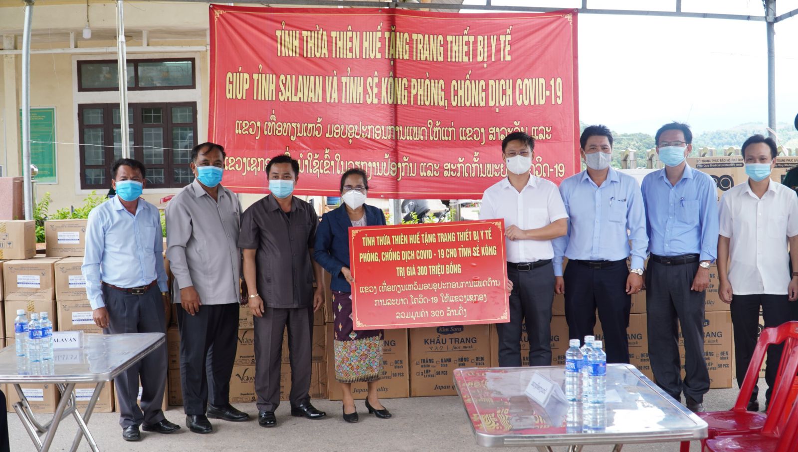 Chia sẻ những khó khăn của hai tỉnh Salavan, Sê Kông (Lào) trong công tác phòng chống dịch COVID-19, tỉnh Thừa Thiên Huế đã trao tặng vật tư, trang thiết bị y tế cho hai tỉnh gồm: 150 ngàn khẩu trang y tế, 3.300 bộ đồ bảo hộ, 3.000 chai dung dịch sát khuẩn, 80 máy đo thân nhiệt, 6.000 đôi găng tay y tế.