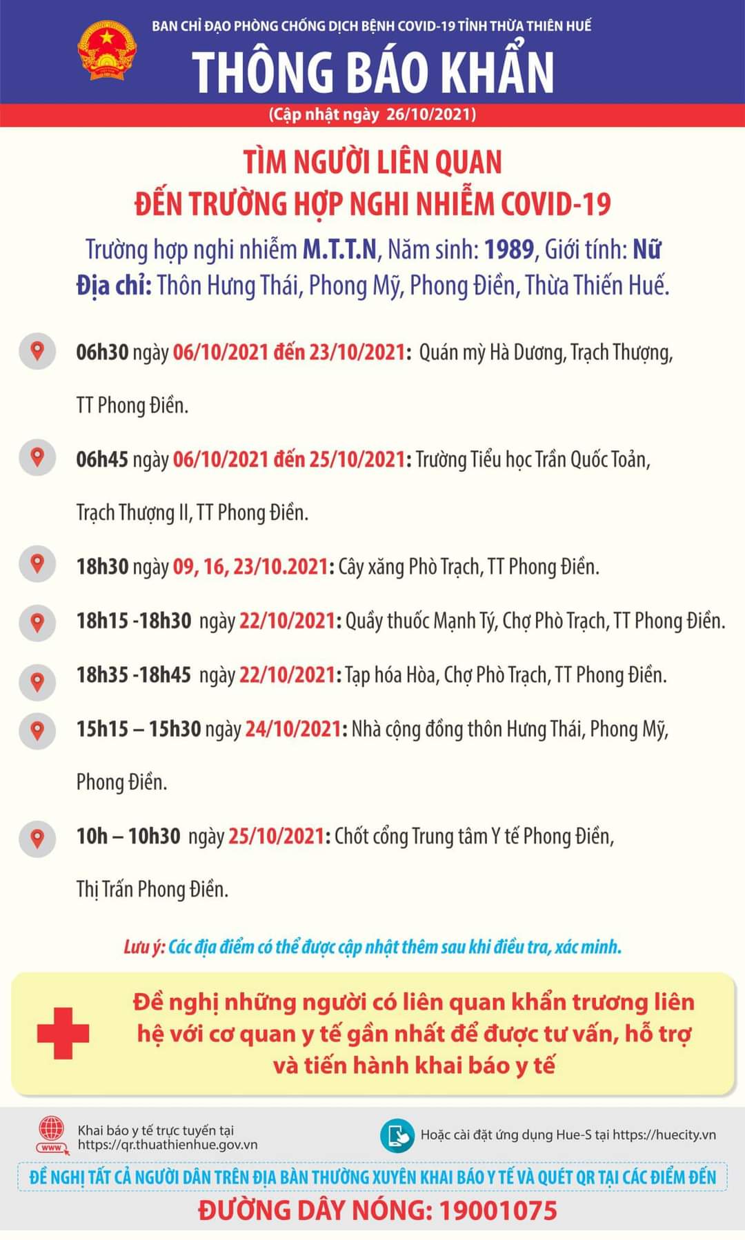 Lịch trình di chuyển của ca nghi nhiễm 14 ngày qua, bao gồm quán mỳ Hà Dương, Trạch Thượng, thị trấn Phong Điền; Trường tiểu học Trần Quốc Toản, thị trấn Phong Điền; cây xăng Phò Trạch, thị trấn Phong Điền; Nhà thuốc Mạnh Tý, Tạp hóa Hòa, chợ Phò Trạch, thị trấn Phong Điền; Nhà cộng đồng thôn Thái Hưng, xã Phong Mỹ; Trung tâm Y tế huyện Phong Điền.
