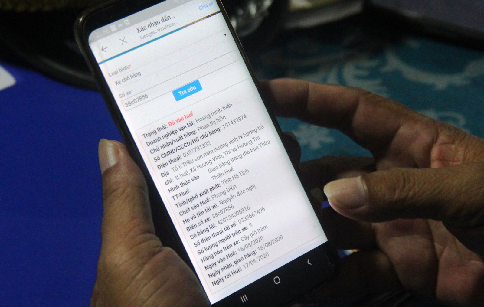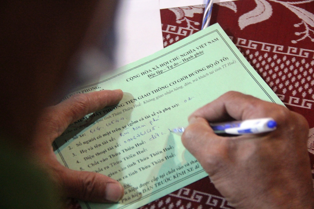 Một tài xế khai báo thông tin với công an khi đi qua Huế