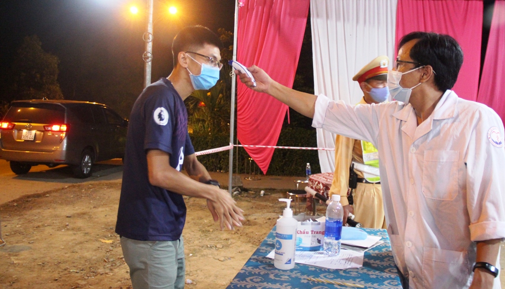 Nhân viên y tế tại chốt kiểm soát tiến hành đo thân nhiệt một tài xế. Trường hợp, các tài xế có dấu hiệu sốt cao sẽ được đưa đi cách ly ngay
