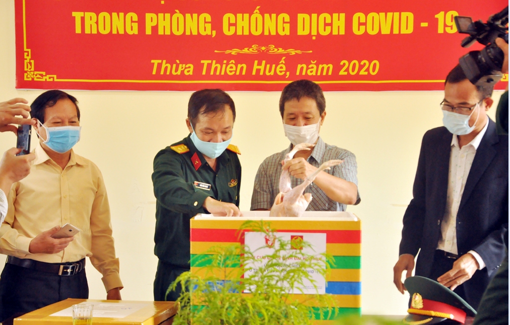 * Trong khi đó, tại Bộ Chỉ huy Quân sự tỉnh, Hội Cựu chiến binh Đại học (ĐH) Huế đã trao tặng 100 con gà nhằm góp thêm chút vật chất, động viên tinh thần các chiến sĩ đang làm công tác phòng, chống dịch bệnh COVID-19.