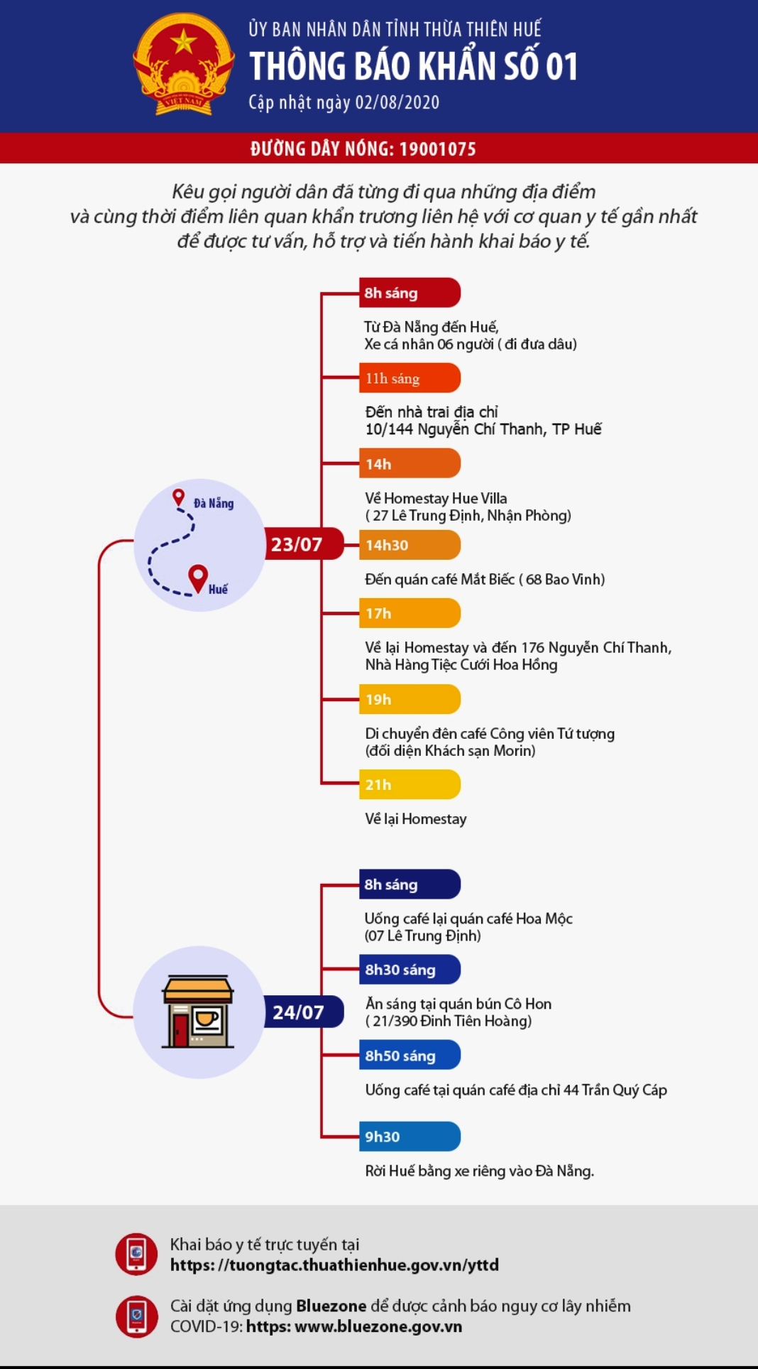 Theo đó, trong 2 ngày 23 và 24/7, ca bệnh 589, 601 và 602 đã đến và lưu trú tại Huế, thời gian cụ thể như sau: 8h sáng ngày 23/7 từ Đà Nẵng ra Huế bằng xe cá nhân, 11h đến nhà 10/144 Nguyễn Chí Thanh, 14h về Homestay Hue Villa ở 27 Lê Trung Định, 14h30 đến quán cafe Mắt Biếc ở 68 Bao Vinh, 17h về lại Homestay và đến 176 Nguyễn Chí Thanh, Nhà hàng tiệc cưới Hoa Hồng. Đến 19h cùng ngày di chuyển đến cafe Công viên Tứ Tượng (đối diện Khách sạn Morin), 21h về lại Homestay.