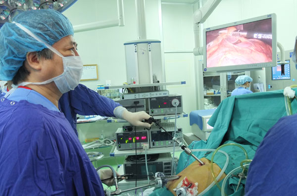 GS Trần Bình Giang (BV Việt Đức) phẫu thuật nội soi một ca ung thư dạ dày tại phòng mổ