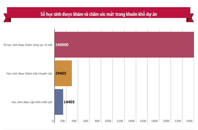 Có 29.405 học sinh được khám mắt chuyên sâu sau khi được khám sàng lọc phát hiện có vấn đề về mắt (đạt 70% số học sinh được phát hiện) và cấp kính miễn phí cho 14.405 học sinh mắc tật khúc xạ (đạt 100%).