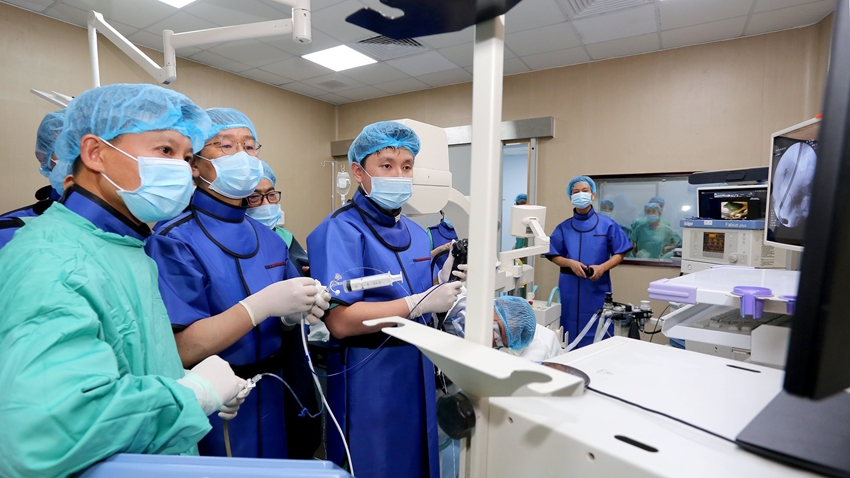 | Ứng dụng spyglass điều trị một ca bệnh tại BVTW Huế . Ảnh: T. HIỂN |
