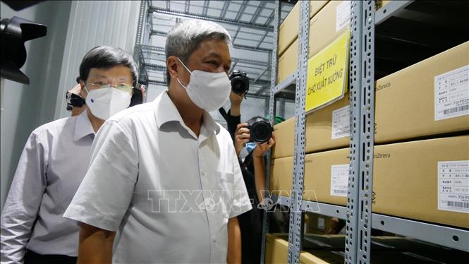 Thứ trưởng Bộ Y tế Nguyễn Trường Sơn kiểm tra công tác bảo quản vaccine Astra Zeneca tại Công ty dược mỹ phẩm May. Ảnh: Đinh Hằng/TTXVN