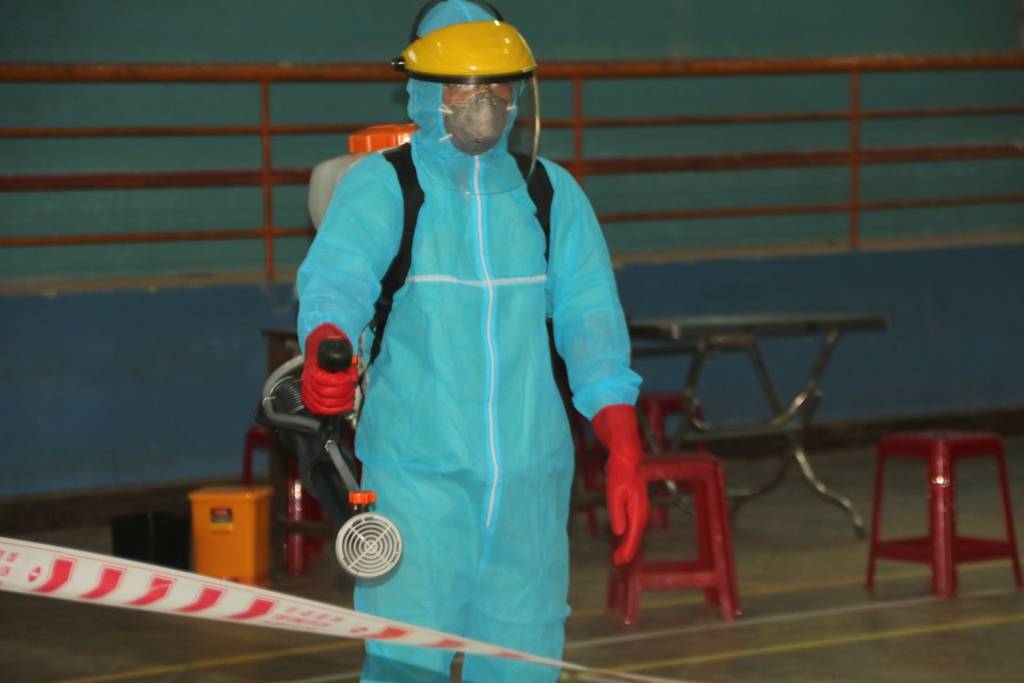 Phun thuốc khử khuẩn tại khu vực lấy mẫu xét nghiệm sau mỗi buổi
