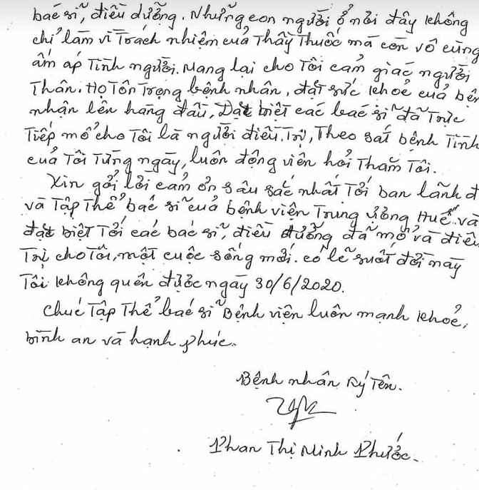Bức thư mới nhất được đề ngày 13/7/2020 là của bệnh nhân Phan Thị Minh Phước (Tam Kỳ - Quảng Nam), người đã được Bệnh viện Trung ương Huế “trao tặng” cơ hội đặc biệt khi các bác sĩ thực hiện thành công phẫu thuật ghép thận tự thân.
