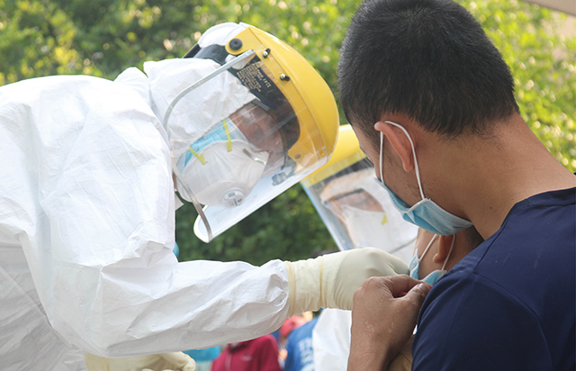 Lấy mẫu xét nghiệm PCR cho người có nguy cơ cao nhiễm COVID-19. Ảnh: THU THỦY