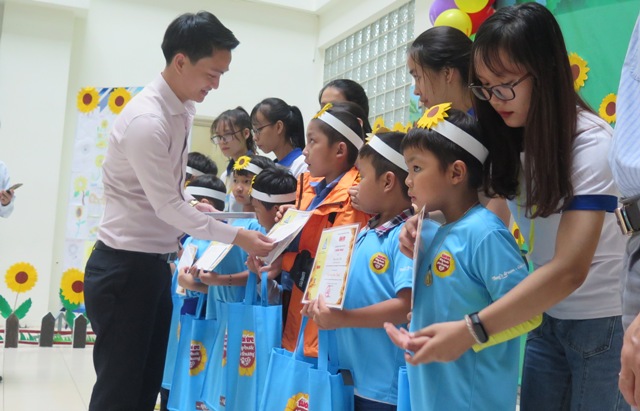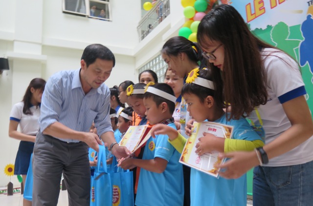 Đại diện nhà tài trợ trao học bổng cho các học sinh là bệnh nhi