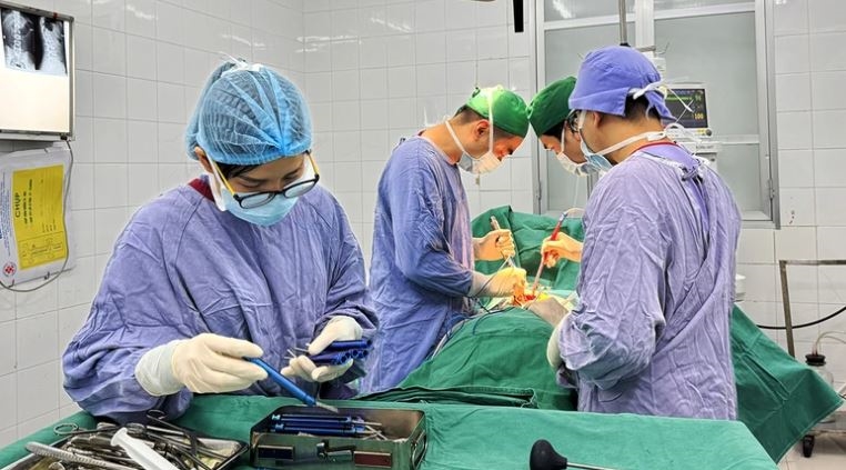 | Các bác sĩ Bệnh viện Hữu nghị Việt Ðức đang thực hiện một ca mổ cấp cứu |