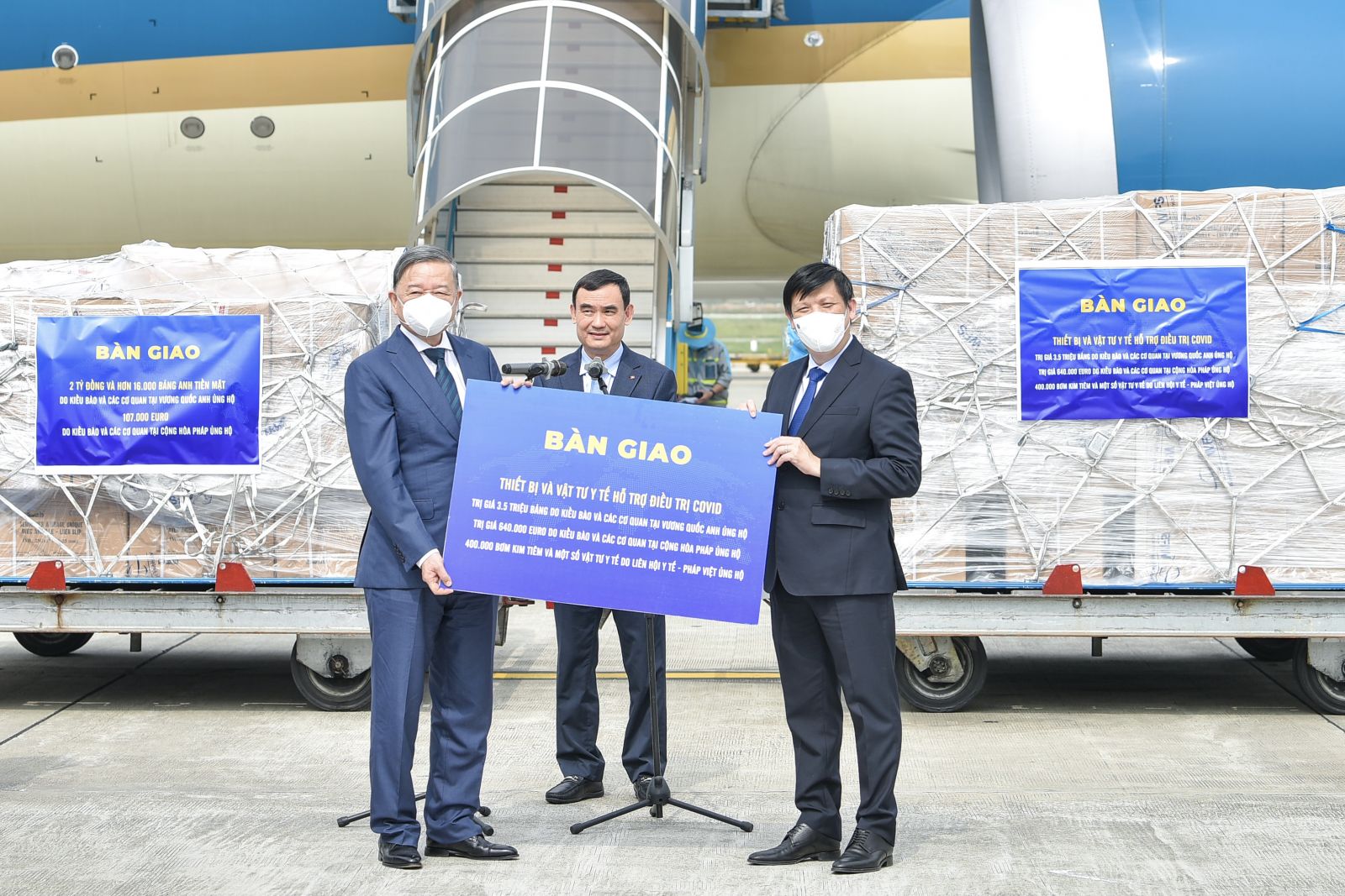 HNN.VN - Trưa 6/11, chuyến bay Vietnam Airlines chở thiết bị, vật tư y tế do kiểu bào và các cơ quan tại Anh, Pháp gửi tặng Việt Nam để phòng chống dịch COVID-19 đã hạ cánh an toàn tại Nội Bài. Lễ đón nhận thiết bị, vật tư y tế được tổ chức ngay sau khi chuyến bay hạ cánh.