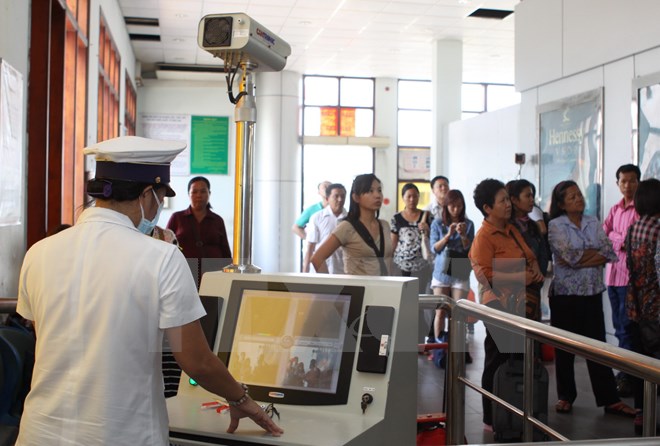 Kiểm tra thân nhiệt khách nhập cảnh ở cửa khẩu. (Ảnh: Phương Vy/TTXVN)
